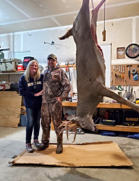 Our oldest daughter Christina was home for a few days and I told her I would try to kill a deer this morning early before she had to leave to go back to the other end of the state. I had a feeling it should be good, but of course you never know if the deer are gonna cooperate and while there is a front moving through it was still in the upper 50's when i walked out. During our archery season, last Thursday October 29th sat a stand that I have not really hunted much the past few years and had a pretty decent buck pass through out of range. I guessed him to be 18 inches inside and thought he had no brows. Later had a doe come through behind me. That was enough for me to kind of form a plan. Noticed when checking cams that there were several scrapes in view of this stand, so I figured I would try and help tick this buck off a little or maybe the bigger 9 that was my primary target. So fast forward to this past Thursday this week, I took a scrape dripper and put some active scrape in and hung it near our property line on the west side, knowing if the deer came on the edge from the opposite direction he might catch the scent and a little grunting might entice him. Trail cam pics had the deer at a scapeline about 1/4 mile away 3 times between midnight and the morning of the 29th, I saw him just 10 minutes before the last pic of him. So it seemed he was cruising making circles the same direction. I had hung a dripper filled with active scrape on that line back before the youth hunt and activity had spiked prior to the neighbors cows getting back there which unfortunately left things cold that weekend of the youth hunt. Had heavy rains yesterday and then the north winds moved in. I had been watching forecasts pretty close and they called for a nne wind, less than ideal for that stand, BUT if the deer did the same thing he would not get into my wind until after I had a shot, and even if he skirted the edge coming from the opposite direction he may catch the scent from the dripper and not ever catch mine until too late. So leave the house for the walk about 5:15'ish and am up in the stand within 5 minutes. Very overcast and it was slow to get light, legal shooting light should have been about 5:53, it was pretty dim, heard the first shot of the morning about 6. Within a minute or so scan around and see a doe right past the bush the scrape dripper is hung on. She is acting a little flaky, looking back and a few times looking up my direction and then across the river. Wind should not have been blowing to her, thought crossed my mind they watched me walk in in the dark. Then she looked back hard and then snapped her head around the other direction looking back again. I know right then there has to be a buck and start to get ready as she starts easing on around to the south. She gets on around about to my 1 o' clock position, not quite in my wind still walking casually, never blew and to be honest once I got my attention on finding the buck I lost focus on the doe and don't know where she went. I look back to the right and catch an antler and cannot see much more than antlers coming through the woods. Then I see the body and he gets in an opening, he did not ever stop though, did not give me a great look as he was steady moving through in the dim light. I got him in another opening and and got on him, but he did not stop, so I reached down and pulled my grunt tube up and blew one time, he stopped then and looked around but I had no shot where he stopped. I could tell he was well outside his ears had decent mass and knew my window of opportunity would likely run out if he got downwind of me or if the doe caught my wind and took off. So I picked a spot on the other side of the tree from where he was stopped as he started walking again. When he stepped in the spot I squeezed the trigger on the accura and he dropped flat on the ground. Thought he was dead, thought wrong. I hit just a little forward above the shoulder, he tried to get up several times and couldn't and kept slamming his antlers in the ground. I had a bad angle to make another shot with him laying on his side, but tried to put one in his armpit thinking I should catch the heart and the bottom of the lung, not sure what exactly happened if I hit something between I did not see through the scope or just what happened but I don't think that shot made its mark. He managed to make a 180 and now all I can see is his back. Feeling sick now, I consider getting down and sneaking around down wind of him and getting a better angle. He managed to get on his feet and go a little ways before bedding down again and then a little buck came through, I had to get down and got a better angle and finished him off. Pretty good body size deer. Not great tine length and not a shoulder mount wallhanger for me but had good mass and has an 18 1/4 inside spread, tough to pass in the backyard. Christina and I looked at the teeth, she thinks he was a 3.5 year old will get a better look after i pull the head out of the compost barrel in the spring.2 points