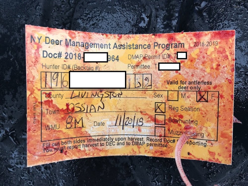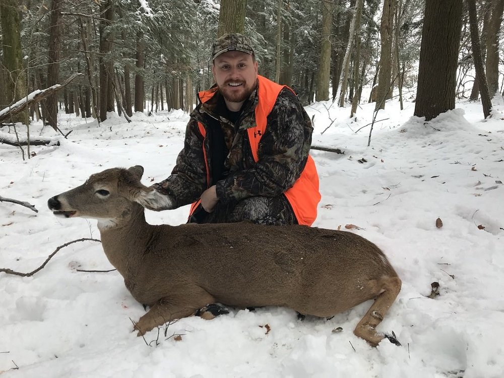 I was in the stand at ~4:45. At ~6pm I had a young doe come by but not hang out long. At 6:59 I saw a buck as he walked in around the edge of the standing corn heading my way. I carefully lifted my binoculars as there were a couple similar 8 points on camera and expected it to be one of them. I could not believe he was the 1st buck I saw. He headed right to me with one of the smaller 8 points right behind him. I expected to get a shot right away and immediately drew. He proceeded to not offer a shot and I was forced to hold for 2+ minutes (confirmed by trail camera pictures) as the smaller buck must of seen me drawing and proceeded to stare me down. Once the smaller buck finally relaxed I was able to let down - the bigger buck had no idea what was going on. I then had to watch them feed at ~20 yards for 25 minutes as he managed to stand with his vitals behind the one branch in between us. After feeding he decided it was time to move on and walked past my stand at ~8 yards on a mission. After watching him for 25 minutes I needed to draw, swing around, settle in on aim, and try to stop him in the matter of seconds. I watched my arrow drive into him up to the fletching as he ran out of site within a few steps. After I replayed the shot in my head I realized I saw him start to turn his head when I tried to stop him but he never did stop. The shot was a hair further back than I hoped but still felt good. After giving him some time my father and I started the tracking. The blood started immediately and had bubbles but was dark so we suspected 1 lung and liver. After a short trail we decided to give a bit more time and come back a couple hours later and look in the dark. We ended up finding him not too far from where we stopped trailing him. He was dead in some tall grass on the edge of the creek that ran past my stand.