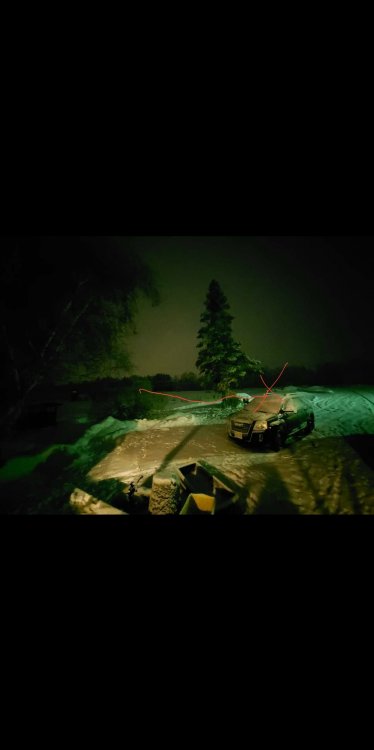Very cool!! Had one follow our golden retriever back, after he chased it off the property. No sooner did the dog return to my call, did his "heel" at my feet. Look up and hear comes a black wolf across the pasture right for us. Followed the line in this picture, stopped at the X and Gus leaped off the deck to about where the front corner of the car is. Luckily it was wise enough not to return the second time or he would have had a face full of buckshot. Coyote populations are through the roof here. Don't need these buggers with them. My neighbor had one feeding at her manure pile every morning last year. How she didn't lose any sheep or goats is beyond me.