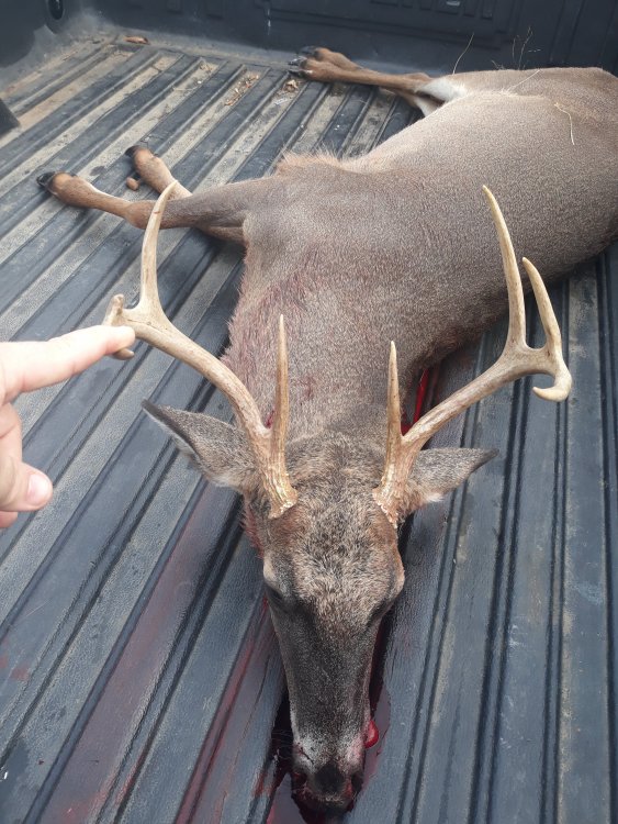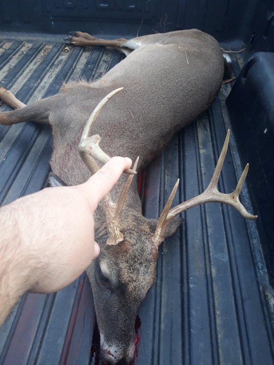 So where I work for a Dept of Energy contractor they are stupidly strict on the covid expose regulations and because of them I got sent home from work Monday and couldn't return to work until cleared so you'd think that it would be a great time to hit the woods but I honestly haven't had the time. Between getting a placement for a child (the wife and I are still fostering) that we could not control last week (long story the child needs a lot of prayers and we ended up not being able to keep him) and the majority of our own children being home because of school closures due to covid I haven't even began to be able to get my hunting stuff together. Well after we got a lot of errands ran Tuesday around 1pm I found myself at home alone for about an hour or two and decided to watch some TV for some quiet time. Quite time turned into a hunt LOL... I glanced out my living room window into the field to the South of my house and saw two deer at about 130 in the afternoon. Knowing the rut is starting to kick off here in East Tennessee I decided to get my rifle out to see what they were. (Rifle was easier to find quick than binoculars). I open the window and see two deer one doe and one buck that I could not tell how big it was just could tell he was not huge but not little either. I decided to ground check him. I squeezed off a round of .30-06 at I'm guessing a range of 375??? He dropped... He got up and staggered off... Got in the truck drove into the field and found really good blood where he dropped. A quick search and he only ran 50 yards into the woods. A fine 7 point that had a broken G3 and almost tied my biggest buck. I couldn't post it on Facebook because of the work quarantine where I'm not supposed to be doing any other activities other than stuff and home and killing a deer just doesn't look like something you'd do at home but in this case it surely was!!! Found my bullet in the backside shoulder which was a first for me and I thought that was pretty cool!