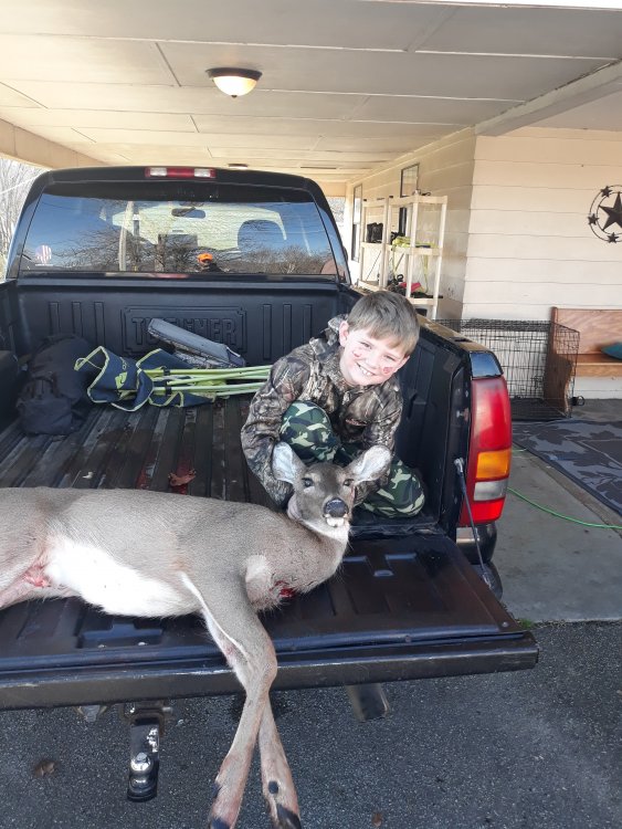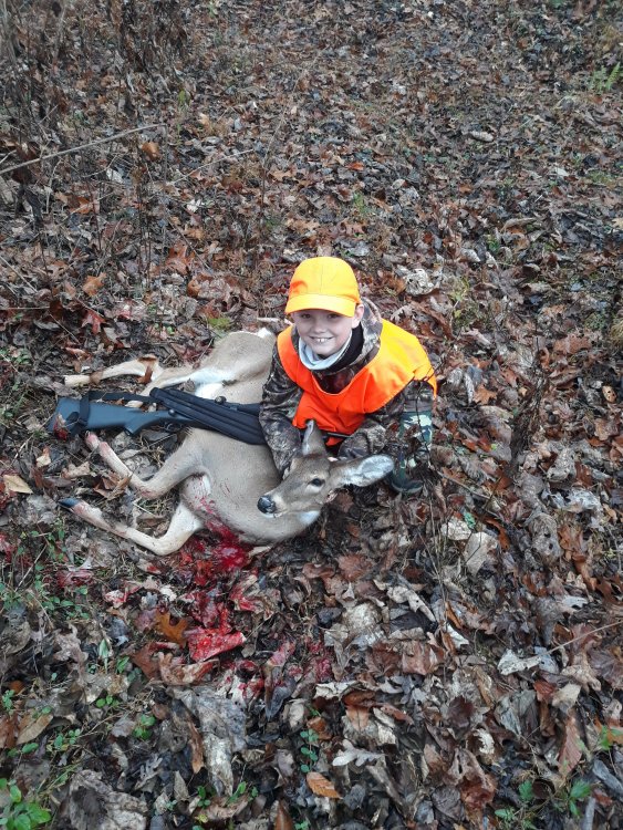 I know this isn't the deer area and I apologise but my son Bentley killed his first deer today. We got to the ground blind at 7am this morning on my wife's ex husband's property (his name is Devan... Bentley was taken in by my wife and him while they were still married so he calls him his other daddy lol). This morning it was really foggy and a tad cold around 35 degrees. Devan told me they cross the old logging road usually around 745 and 930... 745 came and nothing... 9 comes around and Bentley is wanting to leave because he was cold and I was wearing my uninsulated turkey hunting boots and my feet were froze too but I made him stick it out. 930 and still nothing... I tell him I want to leave no later than 11 just to be sure... I remember the last time I checked the time per his request it was 1010... What felt like seconds later Bentley is practically punching me in the leg telling me to look to my left... There stood a big doe that snuck up behind us because the heavy fog acted almost like a mist and the leaves were a little soggy... We couldn't even hear the squirrels playing in the leaves in front of us. After I finally got him to snap out of his goofy grin of excitement and get the deer in the scope. (Let me back up and say the original plan was to use my .223 AR because Bentley is deadly with it at 100 yards but with my fore grip and magazine it wouldn't fit and rest out the blind and I brought my .30-06 as backup just in case that was a problem.... To add to that ol Dad wasn't about to tell him this gun will kick a lot more than that .223 because he did ask and I played it off like it was the same hahahahahaha). The deer saw me... I made eye contact with the deer and I was getting nervous because it was literally taking him an entire lifetime from my view to get on this deer that's less than 30 yards away. The deer starts to slowly make is way in the direction it was going and I stop it just past a tree. I click the safety off and wait what seemed like another lifetime and BANG... All I see is this deer literally pouring blood out of it's chest and she drops... We both start the celebration and Bentley proclaims that gun kicks hard!!! I had a pretty good laugh at that... Y'all might not agree with me but he knows how to handle a rifle and I knew if I told him it kicked he wouldn't squeeze the trigger like he's supposed to. I've seen videos of kids killing their first deer and getting the buck fever after the fact and shaking uncontrollably. That is what happened to Bentley... I started shaking and got that same old feeling I got when I killed my first deer. Had I been thinking I would've recorded the kill from my phone but I broke out the phone for a little interview after we celebrated for a minute. Got to video the recovery. Super proud Dad moment that we'll remember forever. 20201127_102102.mp4 20201127_101556.mp4 20201127_102102.mp4