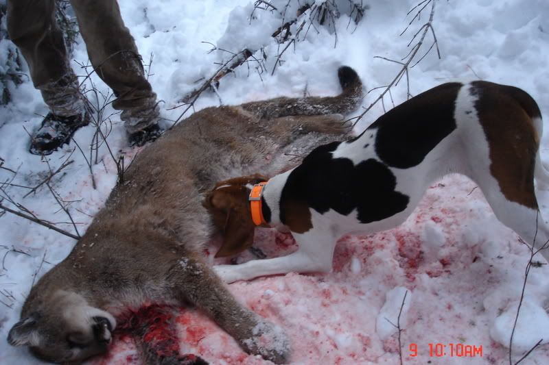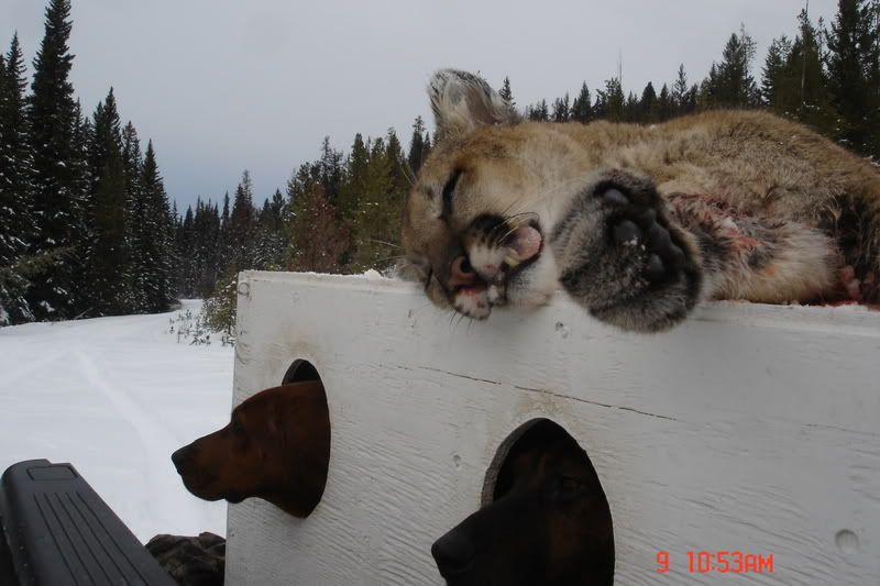 Guest BcHunter Posted December 12, 2006 Report Share Posted December 12, 2006 EX and i got out for the weekend to out the chase on some cats...our first chase was a Bobcat, our buddy released his two top hounds to see if they could sort the tracks out. They came up with nothing after running them back and forth. Maybe 20min down the road we find a fresh set of cougar tracks http://i102.photobucket.com/albums/m117/BCHunter4Life/DSC04628.jpg?t=1165899687 We again take the two lead hounds on leash to see if they sort them out, when they had it EX dumped the remaining hounds out of the box. Maybe 20-30minutes later we had it treed. http://i102.photobucket.com/albums/m117/BCHunter4Life/DSC04633.jpg?t=1165900089 here is Boone climbing the tree http://i102.photobucket.com/albums/m117/BCHunter4Life/2006cathunt017.jpg?t=1165900252 some of the hounds http://i102.photobucket.com/albums/m117/BCHunter4Life/DSC04635.jpg?t=1165900304 here is Rambo, Halter and Boone(my hound) http://i102.photobucket.com/albums/m117/BCHunter4Life/DSC04638.jpg?t=1165900475 here is my cougar, not a big one but my first http://i102.photobucket.com/albums/m117/BCHunter4Life/DSC04648.jpg?t=1165901100 http://i102.photobucket.com/albums/m117/BCHunter4Life/DSC04675.jpg?t=1165901299 here is the cougar last meal http://i102.photobucket.com/albums/m117/BCHunter4Life/DSC04668.jpg?t=1165901797 more cat tracks later on in the day http://i102.photobucket.com/albums/m117/BCHunter4Life/DSC04681.jpg?t=1165902875 We saw a tonne of tracks though the day...a few fresh cougar tracks but nothing big..Ex wanted a nice big old Tom Quote Link to comment Share on other sites More sharing options...